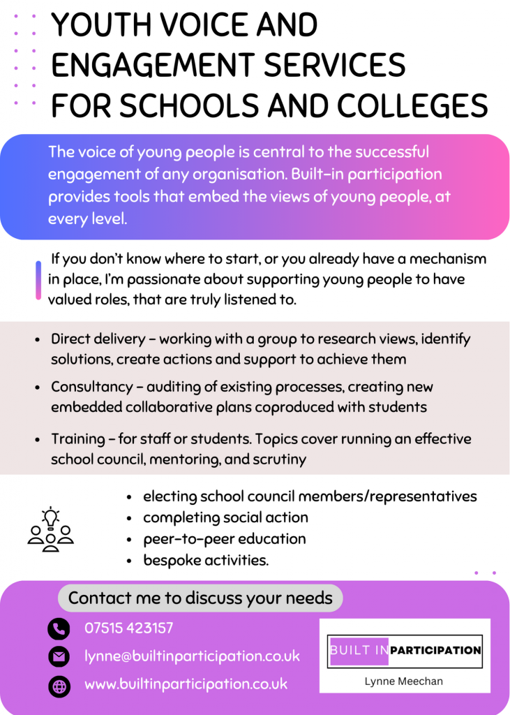 I can offer solutions to built in participation, which ensures youth voice is a long term, embedded part of what you do.